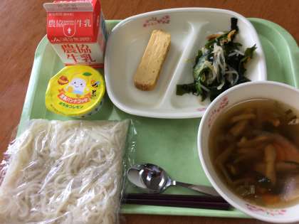 本日のメニューは、五目うどん/厚焼き卵/わかめときゅうりの和え物/豆乳パンナコッタ/牛乳。