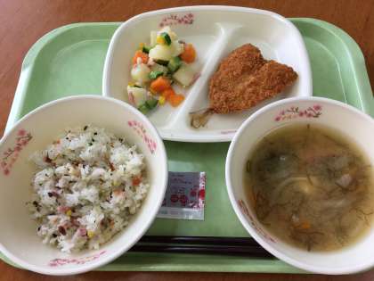 本日のメニューは、野菜のはなやかごはん/もずくのみそ汁/あじフライ/和風ポテトサラダ/牛乳。