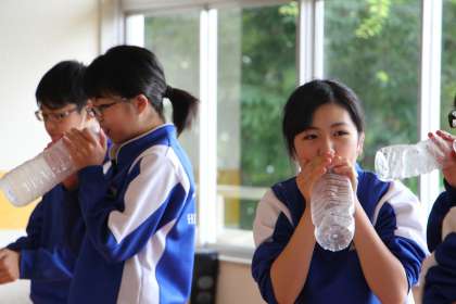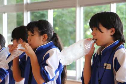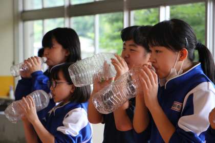 吹奏楽部の皆さんがペットボトルに思い切り息を吹き込んでいる姿に出会いました。