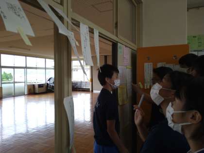 友達の短歌をみんなで鑑賞。笑ったり、感心したり、十分に味わったようです。付箋に感想一言。