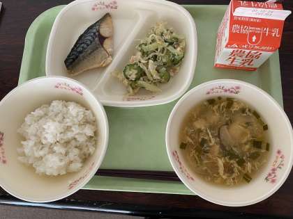本日のメニューは、ごはん/にら卵汁/さばの塩焼き/ささ身和え/牛乳。
