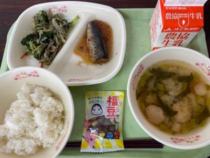 麦ごはん/仙台ふのみそ汁/いわしのしょうが煮/ブロッコリーのごま和え/節分豆/牛乳。
