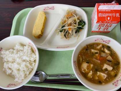本日のメニューは、ごはん/マーボー豆腐/厚焼き卵/もやしのナムル/牛乳。