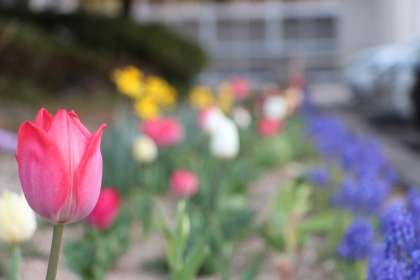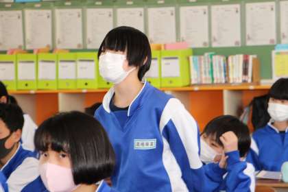 1年生の帰りの学活の風景です。教科係が授業の連絡をしっかりと行っていました。昨年度秋の奉仕活動で植えた花々も添えて。