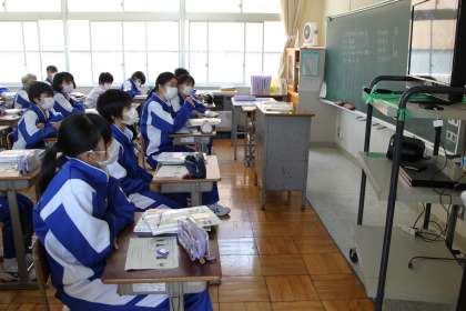1年生では、「春」第1楽章を学習しました。弦楽四重奏で使用される楽器について、生徒にとって親しみのある曲を実際に演奏している動画を見ながら、楽器の特徴や音色について理解を深めました。