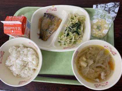 本日のメニューは、ごはん/豚汁/さばのみそ煮/しょうが和え/冷凍パイン/牛乳。