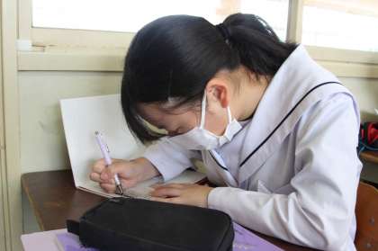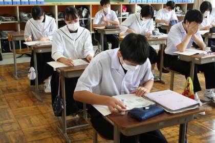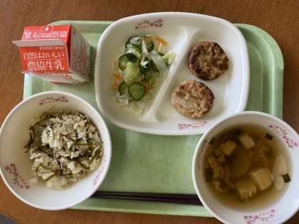 本日のメニューは、まぜごはん/かき玉汁/県産とりつくね/浅漬け/牛乳。