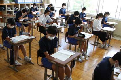 各学級では、放送に耳を傾けて聞いていました。