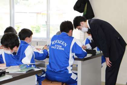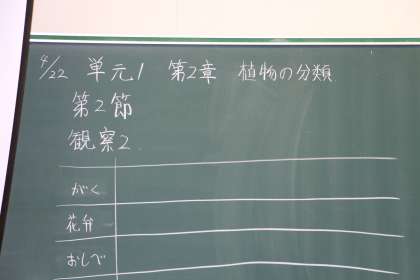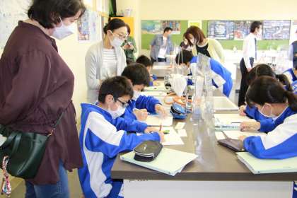 1年2組は理科室で、植物の分類の授業でした。保護者の方々が生徒の席に歩み寄り、じっくりと参観していました。