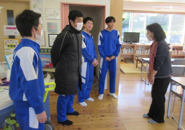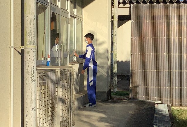 足を痛めているため歩き回ることができない生徒も、ガラス拭きに取り組んでいました。立派です。