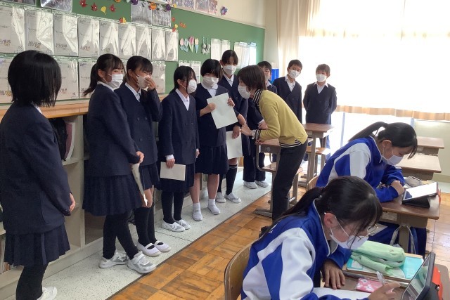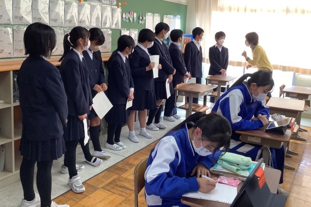 3年生が問題に取り組んでいる間、小学生は英語科担当教師から英語で質問されています。しっかり答えられていました!