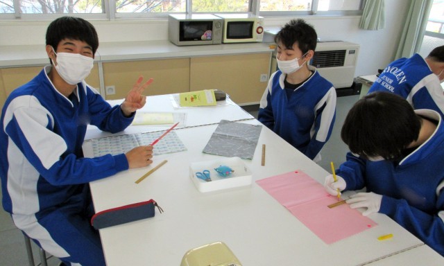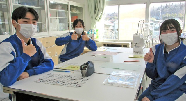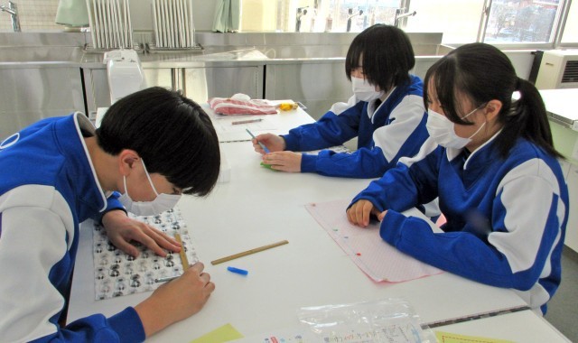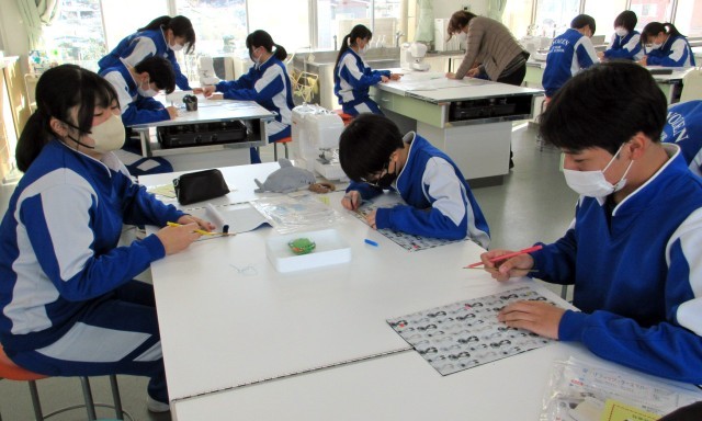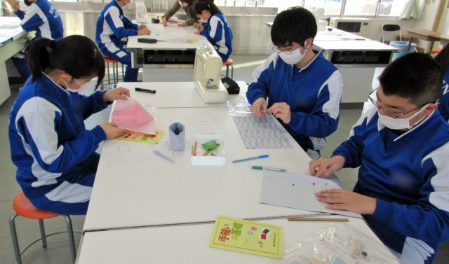 3年家庭科では、「生活を豊かにする工夫」をテーマにティッシュケース作りに挑戦しています。