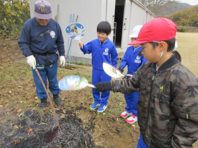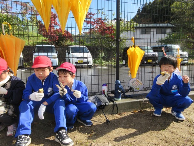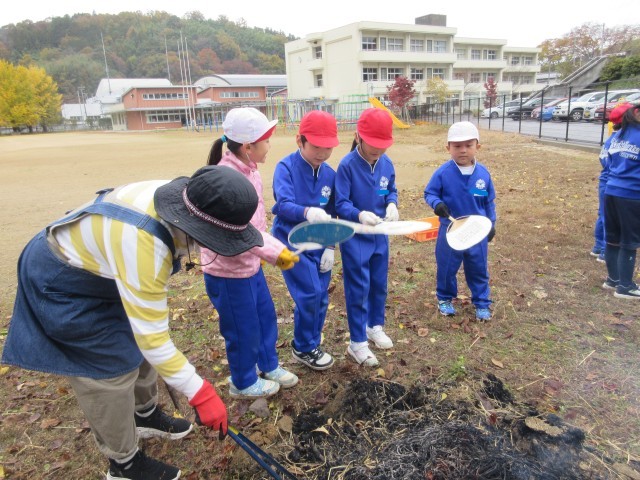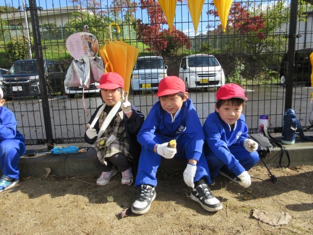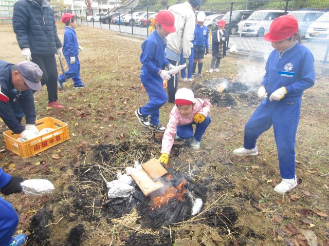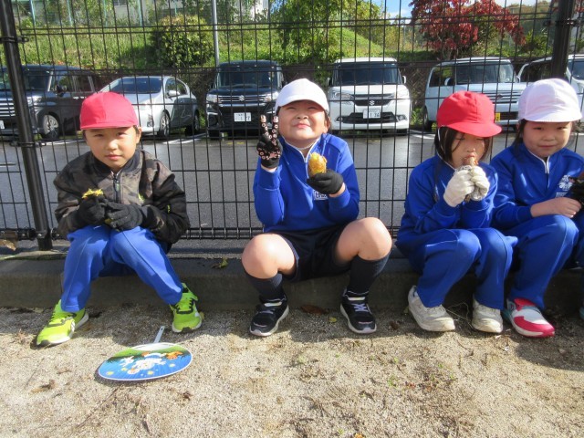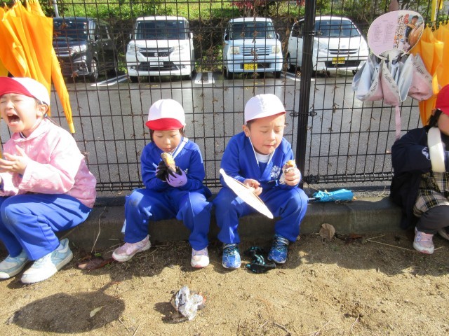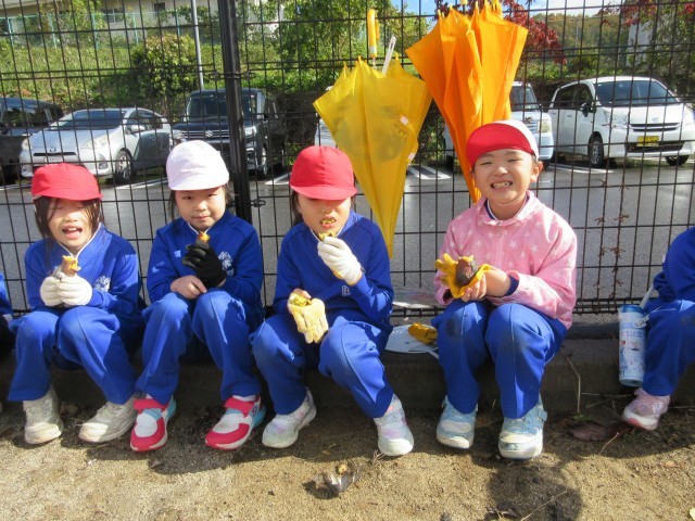 あいにくの天気でしたが、火起こしやさつまいもを焼いている間、外で元気に「てるてる坊主」を歌ったおかげで、晴れ間もみえ、おいしい焼きいもを食べることができました。自分たちで収穫したさつまいもは、とっても甘くてホクホクでした!!