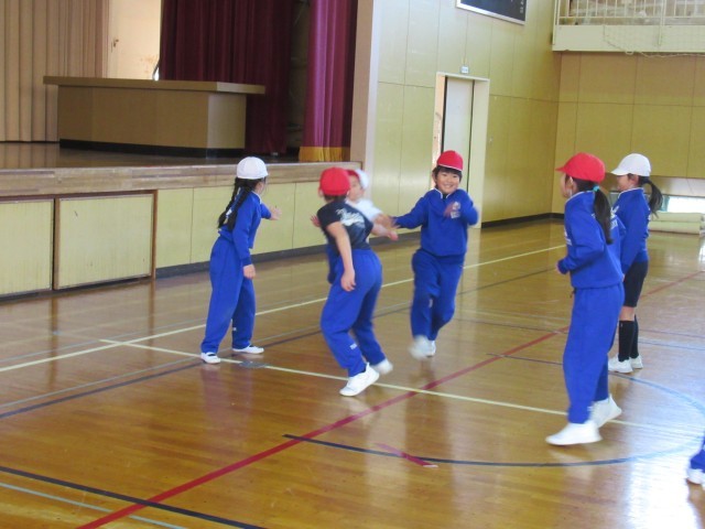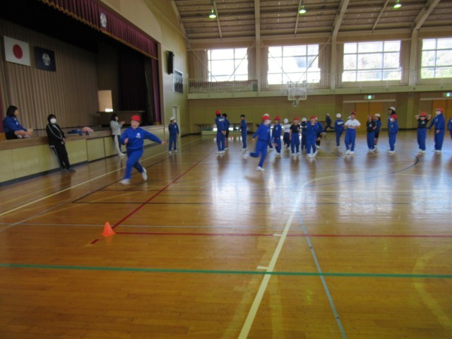 体育館前方ではリレーをしていました。いつもよりトラックが小さかったので、上手く走るのが難しかったようですが、それもいい練習ですね!