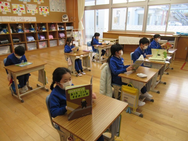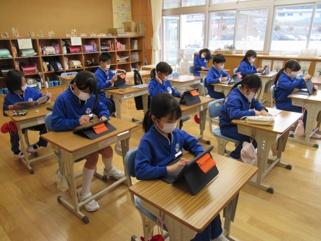 1~3年生が過ごす新校舎はしんと静まり返り、読書やタブレット学習を行っていました。