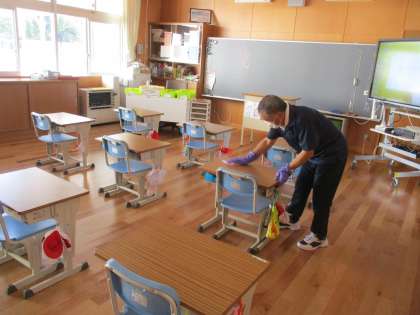特別教室や放課後の教室内の机やいす、階段の手すりやドアノブ、電子黒板の画面やタブレットパソコン等、消毒作業をする箇所はたくさんありますが、一生懸命に消毒を行っていただきました。