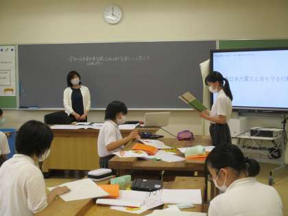本日のプログラムでは、昨年度の10月に東日本を襲った台風19号の被害状況について知り、そこから土砂災害の種類、地図を基にした学校と自分の家の位置と通学経路を確認し、月舘地域の防災マップと照らし合わせながら、どんな災害が想定されるのかについて学習しました。
