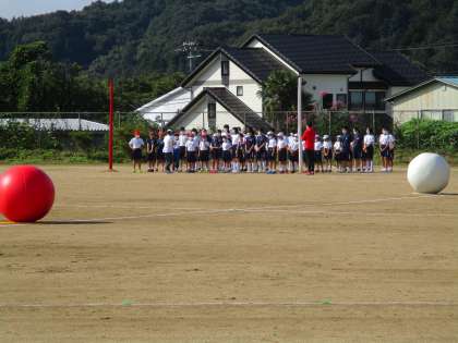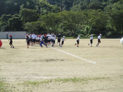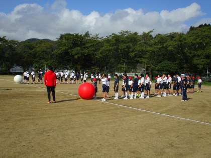小学校と中学校の体育の時間を合わせ、小学生と中学生が一緒になり、校庭で運動会に向けた合同練習をしています。