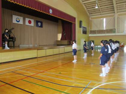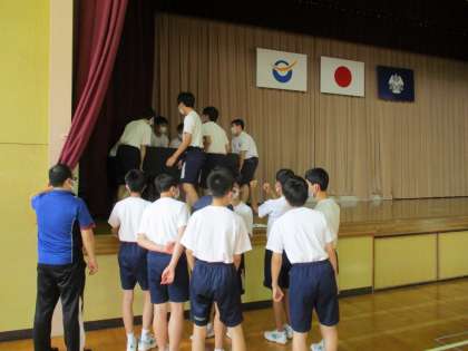 本日のお昼休みに、明日行う支部中体連新人大会壮行会の練習を中学生全員で行いました。