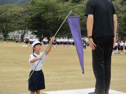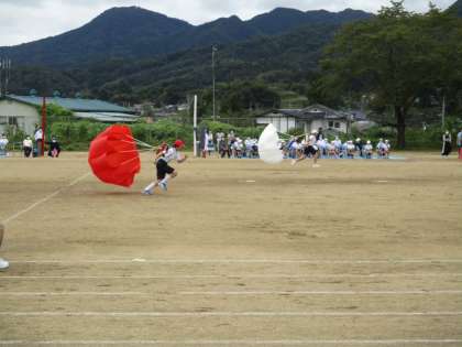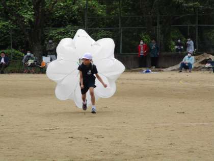 小学5・6年生と中学1年生の出場種目「紅白対抗 開け!パラシュート」では、走ってもなかなかパラシュートが開かない時もありましたが、パッと開くとパラシュートの鮮やかな色合いに目を奪われるようでした。さすがに小学校高学年は体が大きくなり、中学1年生もそうですが、なかなかランドセルに腕を通すのが大変そうな児童・生徒の姿も見られました。