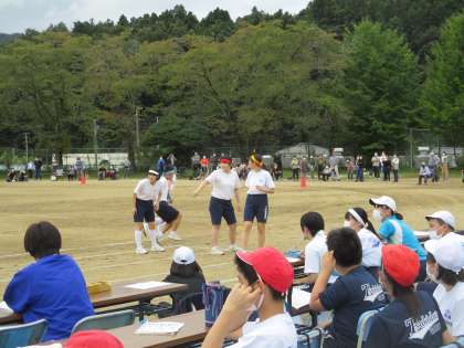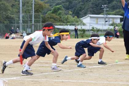 小学1年生から中学3年生まで、男女合同で、赤、青、白、黄の4つのチームに分かれて「紅白対抗リレー」が行われました。小学1年生同士で行うポジション決めのじゃんけんの結果は・・・リハーサルの時と全く同じ・・・。もしかしたらみんな、出すじゃんけんの種類・順番が同じかも?・・・。