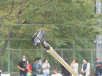 マイクスタンドに止まったトンボの向こうの木々には、赤黄の色づき始めた葉が・・・。そろそろ秋が深まってくるようです。