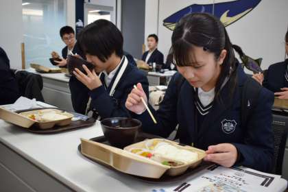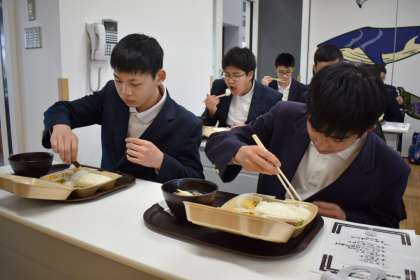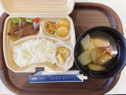 マダラのからあげ・イナキビごはん・鮭の汁物です。
