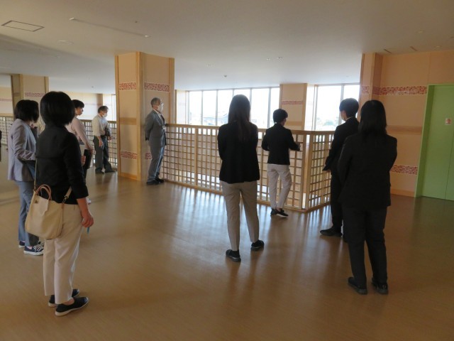 校舎見学では、ユニバーサルデザインに配慮し、スロープや手すりなど、児童生徒の移動や活動がスムーズにできるよう設計された校舎を見学することができました。また、校庭・体育館・かがやき広場などの広いスペースの施設をはじめ、生活訓練室・水治訓練室・作業室など必要な力を身に付けるための様々な施設があり、素晴らしい環境で学んでいることを実感しました。