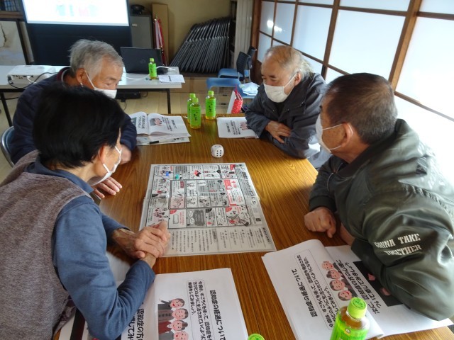 講話の内容が、1認知症についての理解、2認知症の基本的対応の理解、3認知症サポーターとして、の3部に分かれており、それぞれ詳しい説明がありました。途中ですごろくを使って、認知症を発症された方がどのように生活されていくようになるかを体験する時間もありました。グループ内で話し合いが行われ、認知症についてさらに理解を深めることができました。