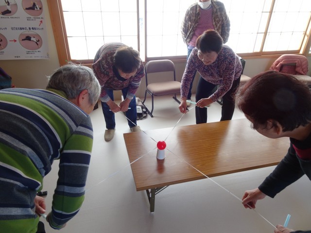 まず、椅子に座ったままできる、ストレッチや筋トレ、簡単な手遊び等、認知症予防や介護予防に役立つ運動を学びました。その後は、グループに分かれてのゲームを行いました。四方をゴムにつながれた輪ゴムでボールをスタートからゴールまで運ぶゲームです。4人の息が合わないとうまく運べないゲームでしたが、慣れてくると赤ボール対青ボールで競争するまでになりました。