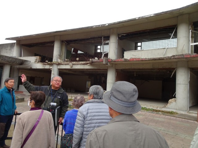 大川小学校では、語り部の方から当時の震災被害の状況を詳しく語っていただきました。児童108名中74名、教員10名が犠牲となりました。大津波警報が発令され、市の広報が避難を呼びかける中、50分間校庭にとどまり続けたこと、二次避難先が想定されておらずその場で議論を行ったこと、結果的に高い裏山ではなく、橋のたもとの小高い場所へ避難を決めたことなど、多数の問題についてお話を聞くことができました。語り部の只野さんは、当時小学校2年生の娘さんと、奥様、お父様を亡くされました。ご遺族の方にとって今も問題は解明されていない思いを持っていらっしゃいます。